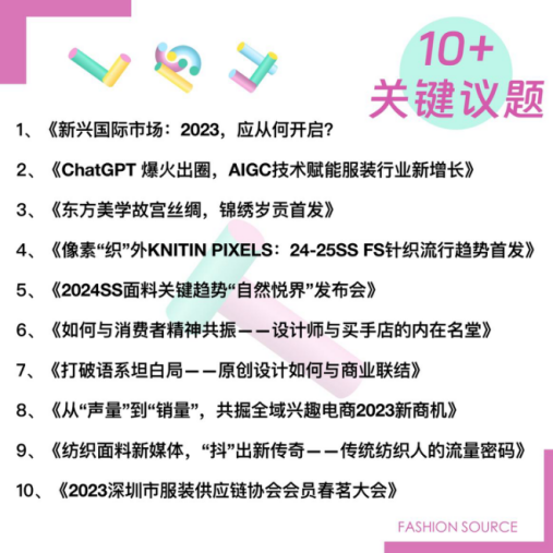最新一季的Fashion Source中國服裝供應鏈峰會將以“樂觀的前行者”為主題,圍繞“國際市場、人工智能、流行趨勢、供應鏈、原創設計、消費洞察、買手渠道、電商生態”八大核心板塊,與品牌供應鏈決策者、企業家、營銷專家、設計師等50+意見領袖同頻對話,講述紡織服裝行業正在經歷的新挑戰、新視野、新勢能。